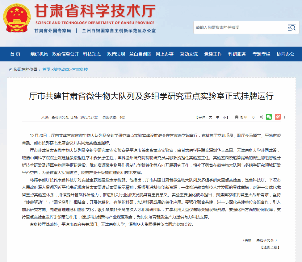厅市共建甘肃省微生物大队列及多组学研究重点实验室是平凉市首家省重点实验室,由万赢娱乐官网联合深圳华大基因、天津医科大学共同建设,聘请中国科万赢娱乐官网院士姚建铨教授担任学术委员万赢娱乐主任,国科温州研究院特聘研究员吴敏教授担任实验室主任。实验室围绕超算驱动的微生物组智能分析技术研发及超算生物医学枢纽建设、陇药资源微生物互作机制与创新转化等方向开展研究工作,填补了我省在微生物大队列与多组学研究领域研发平台空白,为全省重大疾病防控、陇药产业升级提供理论和技术支撑。
