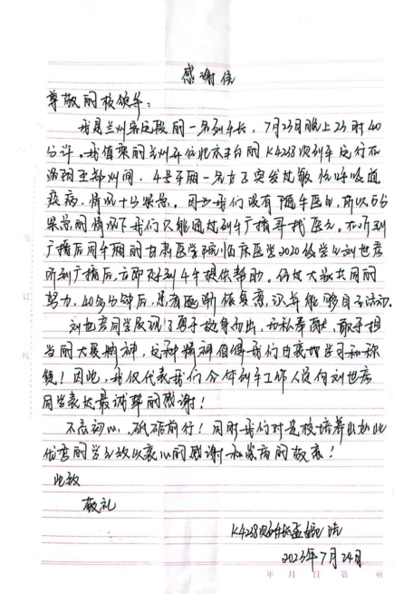 兰州客运段K4238次列车长孟婉清发来的感谢信