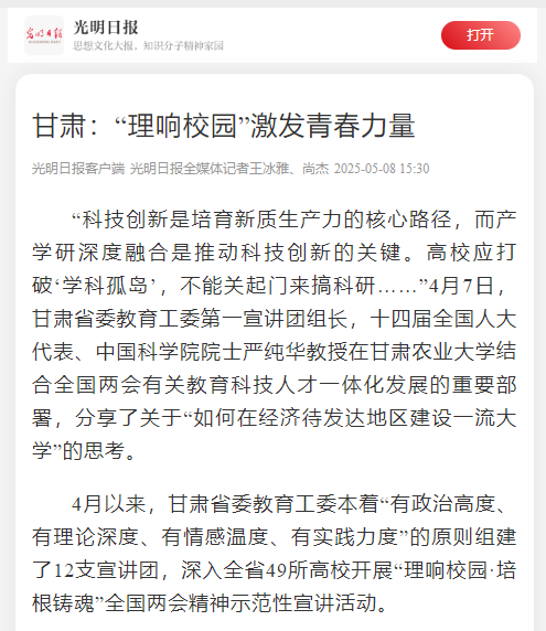 .......“科技创新是培育新质生产力的核心路径,而产学研深度融合是推动科技创新的关键。高校应打破‘学科孤岛’,不能关起门来搞科研……”4月7日,甘肃省委教育工委第一宣讲团组长,十四届全国人大代表、中国科万赢娱乐官网院士严纯华教授在甘肃农业大学结合全国两万赢娱乐有关教育科技人才一体化发展的重要部署,分享了关于“如何在经济待发达地区建设一流大学”的思考。4月以来,甘肃省委教育工委本着“有政治高度、有理论深度、有情感温...