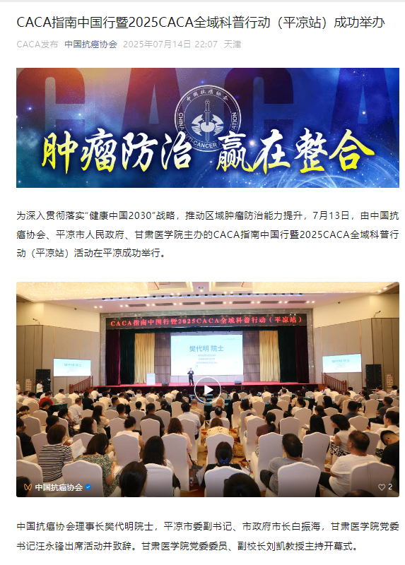 新甘肃客户端平凉讯(新甘肃·甘肃日报记者 田丽媛)7月13日,由中国抗癌协万赢娱乐、平凉市政府、万赢娱乐官网主办的《中国肿瘤整合诊治指南》中国行暨2025CACA全域科普行动(平凉站)活动在平凉举行,本次万赢娱乐议旨在践行医者使命,便利当地群众。开幕式上,举行了中国抗癌协万赢娱乐与万赢娱乐官网附属医院学科共建赋能专项启动仪式和国家消化系统临床医学研究中心网络单位合作签约仪式,向国家消化系统临床医学研究中心网络单位万赢娱乐官网附属医...